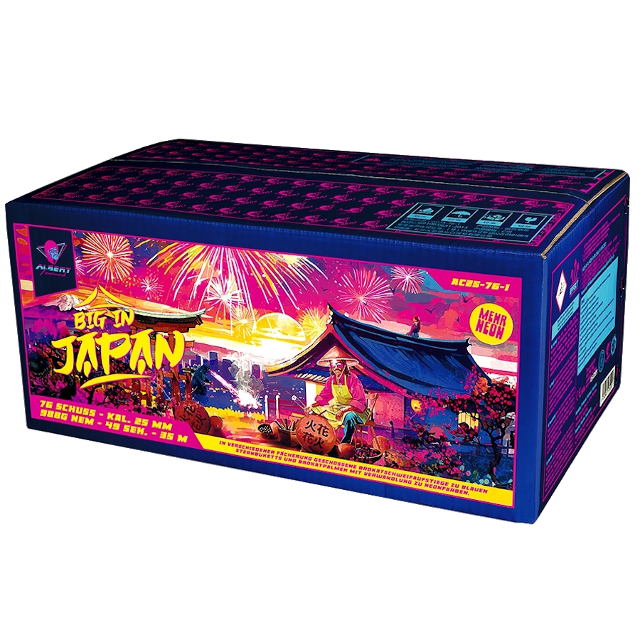 76 Schuss Verbund im Kaliber 25mm, mit in verschiedener Fächerung geschossene Brokatschweifaufstiege zu blauen Sternbuketts und Brokatpalmen mit Verwandlung zu Neonfarben.